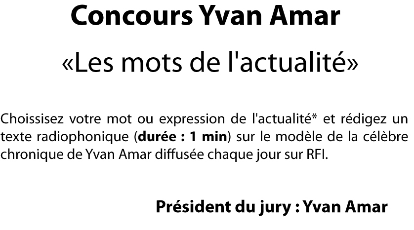 Il parle tellement vite que je perds quasiment la première partie de ses propos, IFC mis à part. Je tapote le conducteur, il s’arrête. En toute honnêteté, j’ai dû user d’un subterfuge dont je me rappelle plus pour qu’il reprenne la teneur de son coup de fil : vous faites partie des lauréats du concours Yvan Amar.